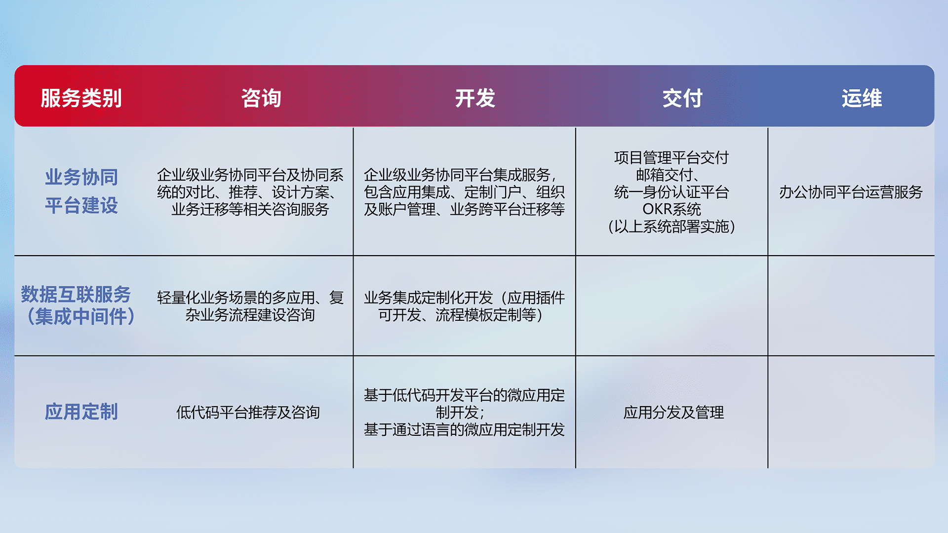 针对钉钉、、、、企微、、、、IDaas等平台级产品提供产品的规划、、方案、、、、交付、、、、定制化开发等服务,,,,实现如统一协同办公、、智能客户服务、、混合会议管理、、、智能数据查询、、等业务场景,,,,实现数字化转型。。。。