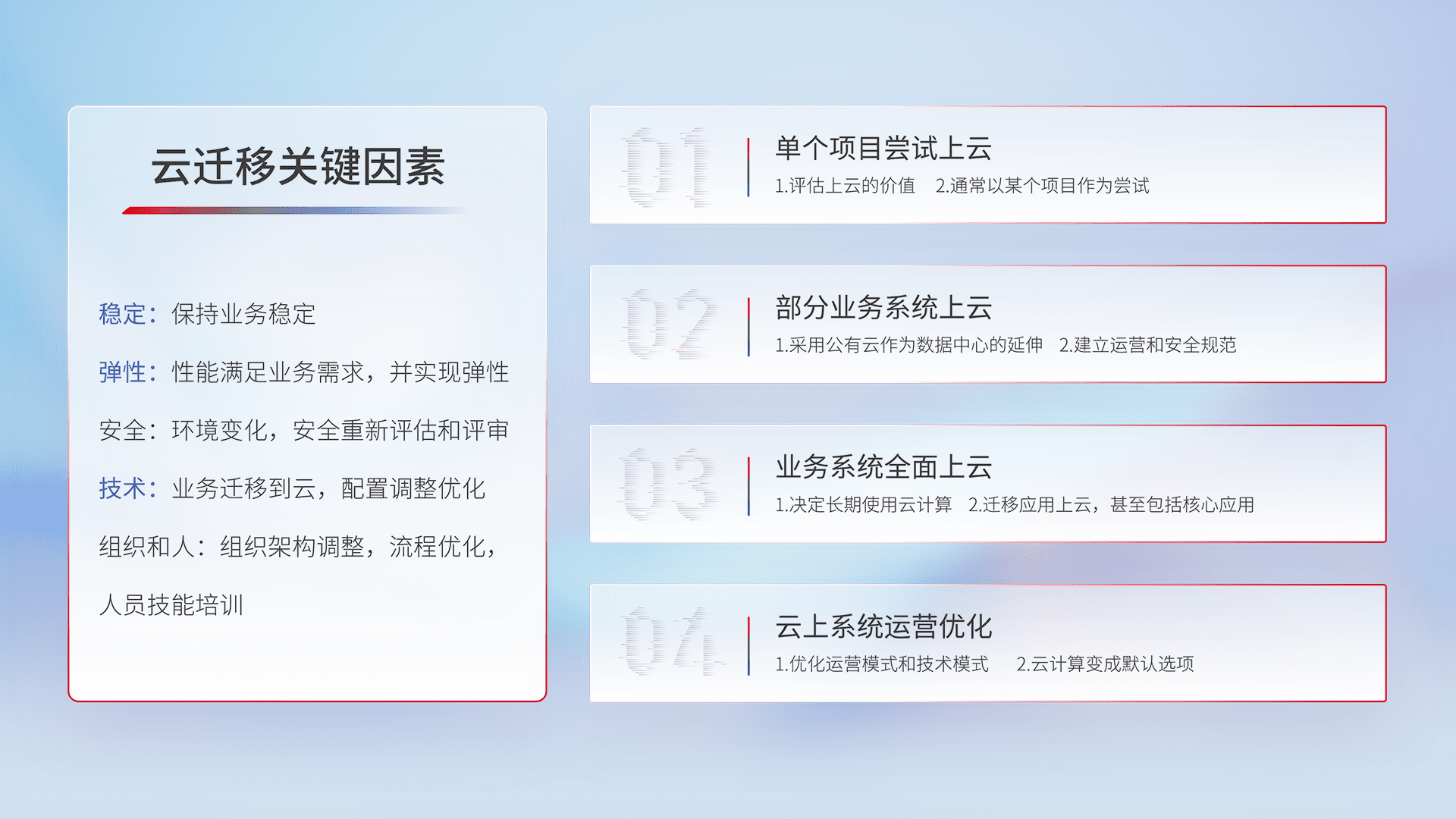 结合实际业务,,,,从规划设计、、云平台选型、、云原生改造、、、数据迁移、、、集成交付,,迁移全过程为客户识别最佳上云路径,,,,做好风险识别管理,,,设计网络架构、、身份权限、、、安全审计合规、、操作审计、、、、日志审计、、、、监控告警策略、、多站点容灾设计等,,对云上基础设施进行整体规划,,,,提升IT治理水平,,,以满足弹性、、、、高可用、、、高性能的需求。。。